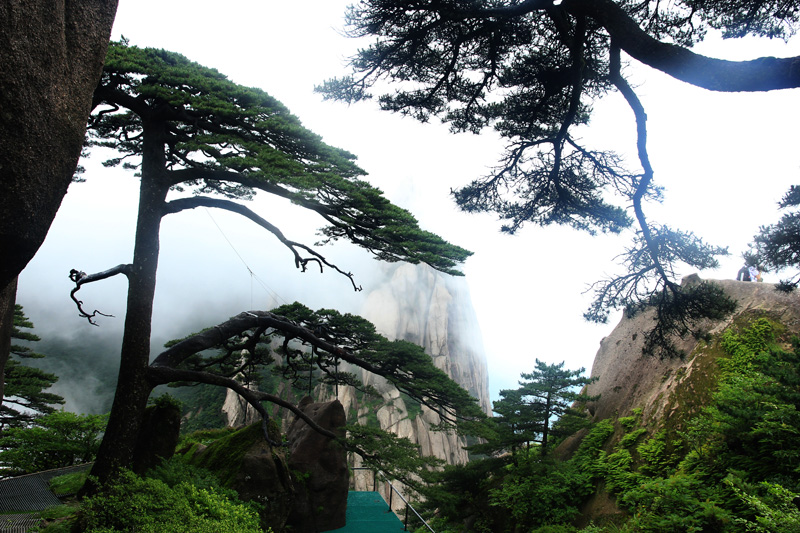 远眺天都峰,山势之险,只是远远的看着,就已经不自觉的发抖,狭窄的道路和几乎垂直的台阶,足以另你心跳加速。因为攀登起来比较困难,长年云雾缭绕,所以一年当中会有几个月处于封闭状态。终于我们到达了玉屏楼。玉屏楼位于天都、莲花两峰之间,是集黄山奇景之大成的佳绝处。著名的迎客松就在玉屏楼的左侧,玉屏楼的后面即是玉屏峰, “玉屏卧佛”就在峰顶,头左脚右,恰似一个人平躺在峰顶。峰石上刻有毛泽东草书“江山如此多娇”。朱德、刘伯承等元帅也在此题词作诗过,徐霞客曾称它为“黄山绝胜处”。远近闻名的黄山迎客松就是在玉屏楼的左侧,倚狮石破石而生,迎客松好似一位好客的主人,挥展双臂,如人伸出臂膀欢迎远道而来的客人,雍容大度,姿态优美。大家都纷纷与这位美丽的“主人”合影留念。站在山顶环顾四周美景,远处群山如画,碧空如洗,微风轻拂,大自然如一位神功巧匠,将黄山雕刻得无与伦比。此刻才明白那句话:感受黄山,天下无山。