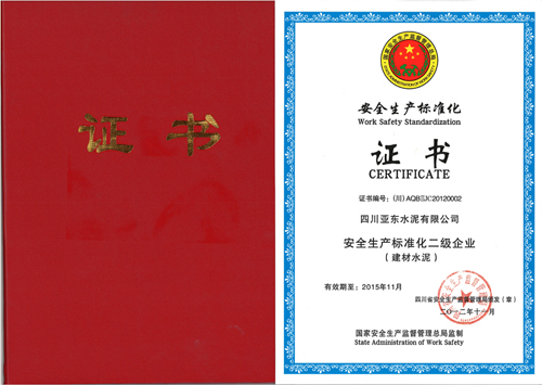 四川亚东水泥于2012年3月全面实施安全生产标准化管理体系,并于2012年10月9日顺利通过四川省安全生产监督管理局专家评审团对公司水泥生产线、石灰石矿山、粘土砂岩矿山三个单元之安全标准化二级达标考评,为四川省第一个通过安全生产标准化达标之水泥企业。