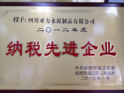 四川省成都市温江区于1月召开2012年经济工作总结表彰大会,会中拟订2013年全区经济工作任务,并表彰去年经济工作先进单位。四川亚力水泥制品公司获中共成都市温江区委、成都市温江区人民政府评为「2012年度纳税先进企业」。