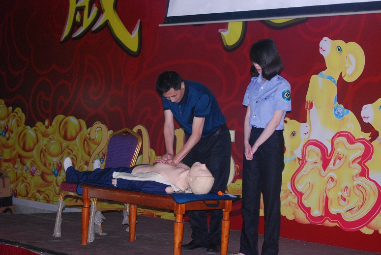 培训中,九江市急救中心讲师以PPT图文并茂的方式主要从四个方面普及急救知识:一、讲解正确拨打120的方法,指导报警人报警时保持镇静,说话简练,正确描述详细地址、伤病人数和病情,听从接警员指挥,进行现场自救/互救;二、对基本医疗急救常识的理论介绍和学习,主要包含烫伤、溺水、中暑、气管异物、心肌梗死及酒精中毒等急救处理方法;三、教授徒手心肺复苏术的动作要领和注意事项;四、与现场同仁进行互动,培训心肺复苏的技术要领和手法技巧,培训同仁积极参与了心肺复苏的现场互动,纷纷表示受益匪浅。为增强培训效果,中心急救专家还利用模拟人为大家演示了如何正确实施徒手心肺复苏术,并为现场体验的员工进行了细致的指导,不时认真回答大家提出的问题,现场气氛十分热烈。