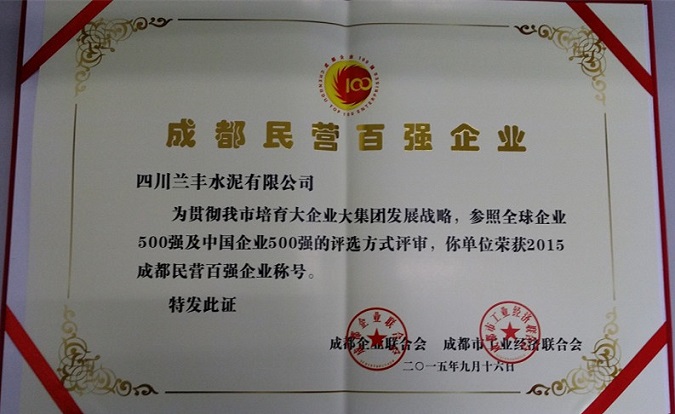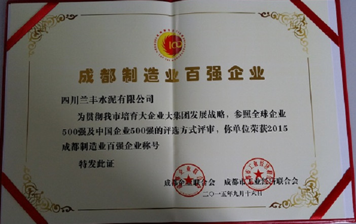 在成都市经信委、国资委、统计局和商务局等部门指导支持和帮助下评选出的“2015成都企业百强”、“2015成都民营企业百强”、“2015成都制造业百强”、“2015成都服务业百强”榜单正式向社会发布。其中,兰丰水泥荣誉入列“成都制造业百强”80位、“成都民营企业百强”69位。