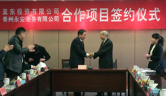 为配合亚泥(中国)所属江西亚东水泥有限公司五、六号线投产后,新增600万吨水泥之销售布局,亚泥(中国)与泰州港务集团合作,投资约2亿人民币设立泰州亚东建材有限公司,并于4月11日举行签约仪式,由亚泥(中国)张才雄副董事长与泰州港务集团蔡年生董事长代表签订,现场气氛友好热烈。