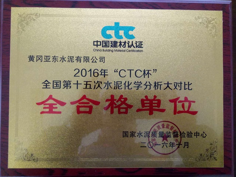 在2016年10月举办的“CTC”杯全国第十五次水泥化学分析大对比中,黄冈亚东水泥有限公司在水泥、熟料、石膏、粉煤灰四个样品,合计35个检验单项全部合格,获得国家水泥质量监督检测中心颁发《2016年“CTC杯”全国第十五次水泥化学分析大对比全合格单位》的荣誉证书。