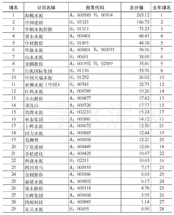 本次排名以独立上市公司为单位,主要考核了水泥销量、利润总额、资产、市值四项年度经济指标,并给予一定的权重,评选以分值形式进行排序。本次评选中所使用的经济指标数据,均以上市公司公布的2014年年报为依据并对公司或集团主营业务中含有其他行业业务,且比重较高的上市公司的经济指标基数进行了相应调整。
