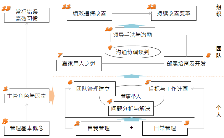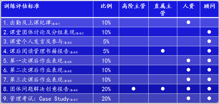 整个MTP课程纲要为管理者的职责与角色、自我管理与认识、日常管理、问题分析与解决、目标与工作计划、团队建立与管理、赢家的用人之道、部属的培育与潜能启发、沟通协调与谈判、领导力打造与激励手法、工作绩效管理及追踪、持续改善及变革管理和经理人常犯的错误及高效的管理习惯。MTP培训形式丰富多彩,有讲师授课讲解、小组讨论、案例分析、模拟演练和拓展活动,实现了“知”、“行”合一的训练构架。本次培训评估标准如下: